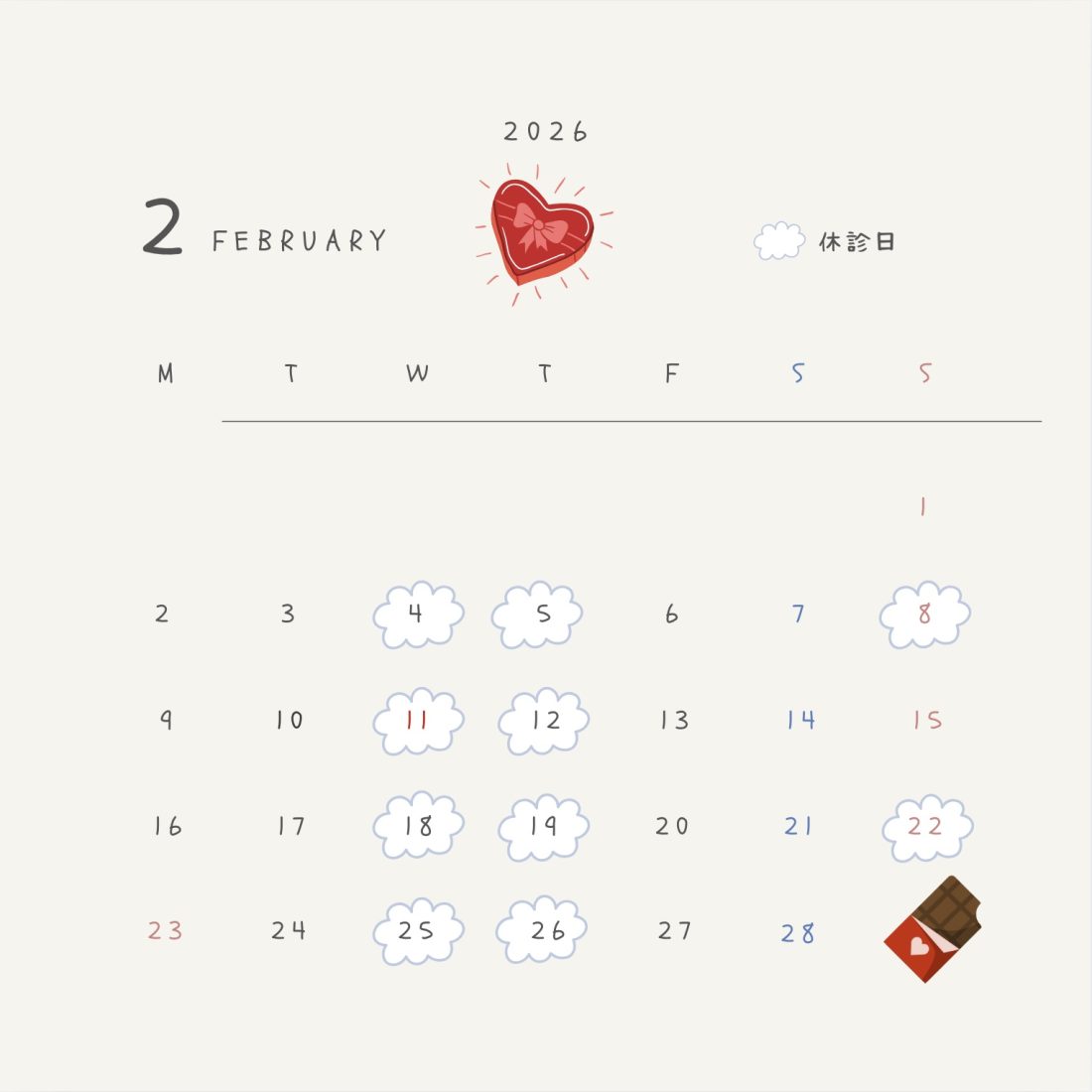 2月の診療スケジュール📅 2026/01/08 こんにちは!2月の診療スケジュールです✨️ 暦の上では春となりましたが、寒さの厳しい季節が続いています。体調に気を付けながら、心あたたまる2月をお過ごしください。 今月もどうぞよろしくお願いいたします。