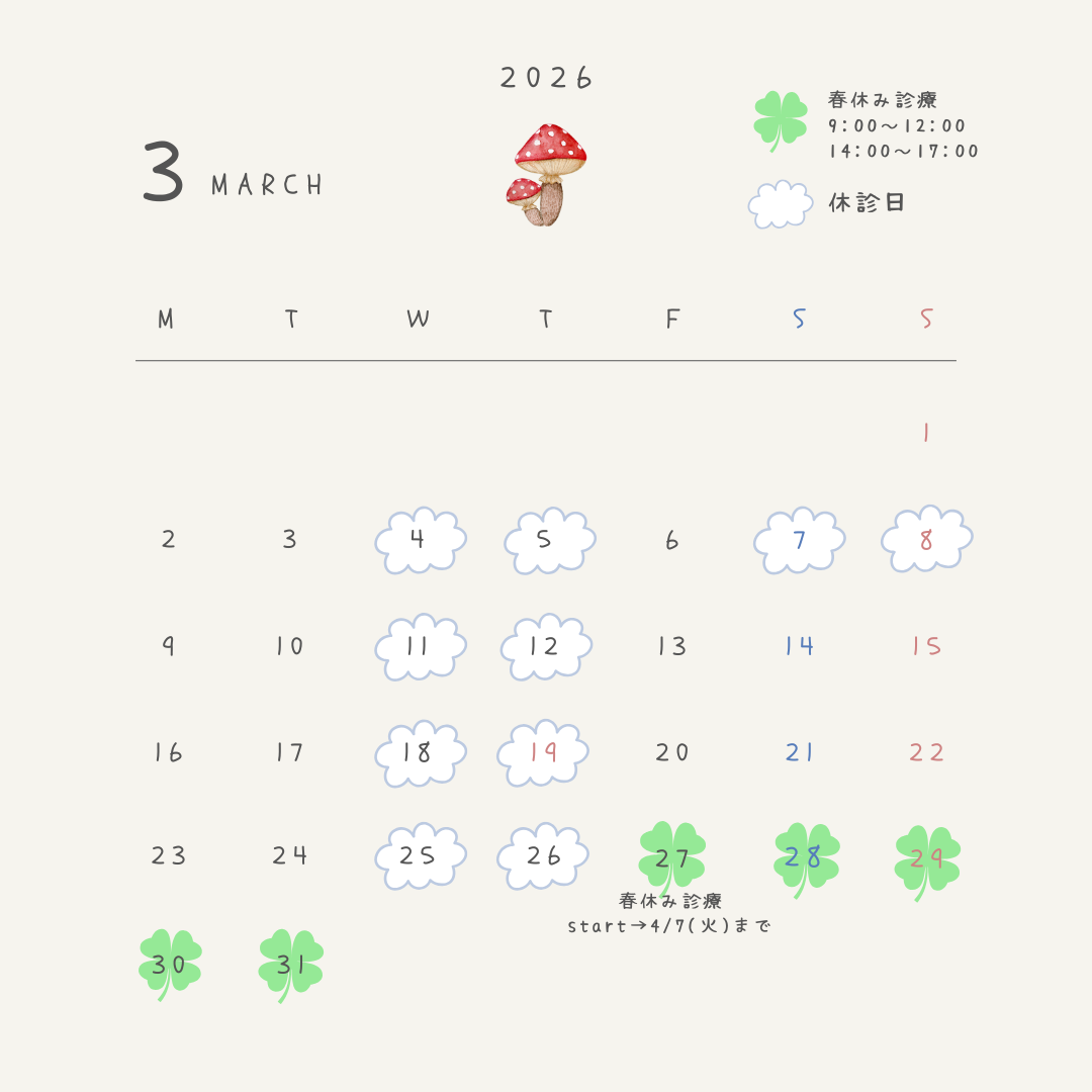 3月は、27日から誠に勝手ながら診療時間が変わり、春休み診療が始まります🙇